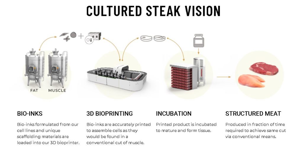 Als Basis für die Herstellung der Biotinte dienen Stammzellen von lebenden Tieren. Derzeit, im März 2021, arbeiten die Forscher in Israel und Belgien daran, ein 100 Gramm schweres Steak auf diese Weise herzustellen. Zuletzt gelang es im „Projekt Carpaccio“ weltweit erstmalig, eine 10 Millimeter dünne Fleischschicht zu drucken, die sowohl aus Stammzellen gewonnene Muskel- als auch Fettzellen kombiniert und verschmolzen hat. Steakholder Foods entwickelt den gesamten Wachstumsprozess dieser Gewebekomponenten.
