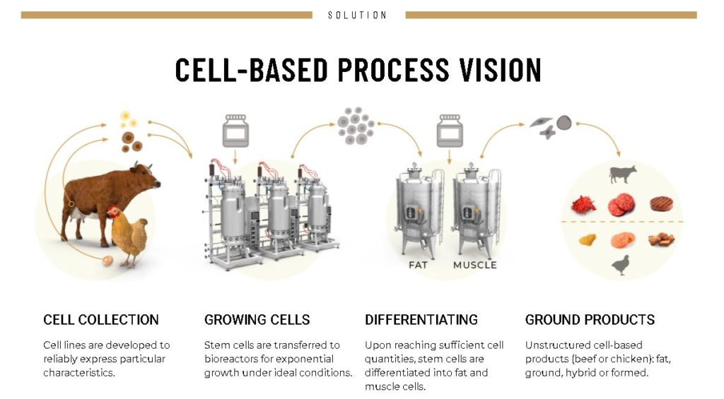 Zu Beginn des Verfahrens zur Herstellung von zellbasiertem Fleisch wird eine Probe der tierischen Nabelschnur entnommen, und eine Zelllinie für die weitere Zellreproduktion entwickelt. Diese Zellen werden anschließend in die Biotinten mit verschiedenen Zelltypen wie Fett und Muskeln differenziert. Der anschließende Druck verläuft dreidimensional, und schafft letztlich die Grundlagen für das gewünschte Fleischstück. Die Strukturen werden in Inkubatoren gezüchtet, bevor sie eingefroren und für den Versand verpackt werden.