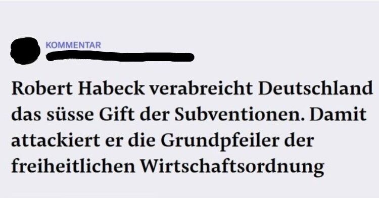 Das Zitat passt meines Erachtens nicht. Habeck subventioniert die Transformationsbranchen wie Auto, Stahl oder Energie. Das tut er, um das Ziel Klimaneutralität zu erreichen und die Resilienz der deutschen Wirtschaft bzw. deren Wohlstand zu erhalten. Inwiefern das ein Angriff auf die „Grundpfeiler der freiheitlichen Wirtschaftsordnung“ sein soll? Das erschließt sich mit nicht.