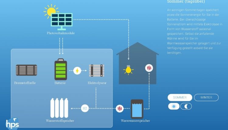 Die Abbildung zeigt, wie das Picea-System im Sommer am Tag arbeitet. Es nutzt die erzeugte Sonnenenergie direkt im Haus oder speichert sie in der Batterie. Per Elektrolyse wird Wasserstoff erzeugt, der für die Wintermonate zwischengespeichert wird. Kern ist also zweierlei: Es gibt einen Kurzzeitspeicher, nämlich die Batterie. Und der Wasserstoff dient saisonübergreifend als Reserve für den Winter. Damit soll den Herstellerangaben zufolge „100 Mal mehr“ Speicher-Kapazität vorhanden sein als nur mit einem Stromspeicher (Alles über Stromspeicher hier).
